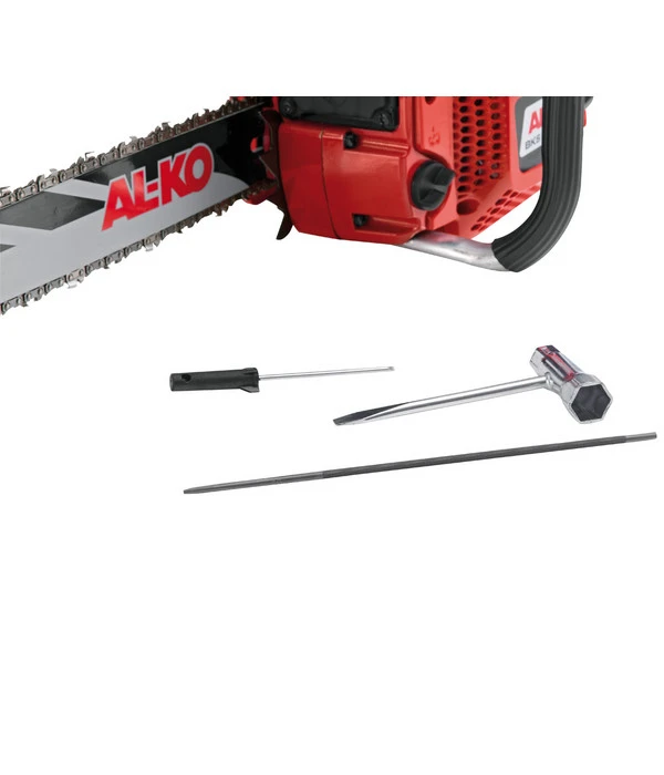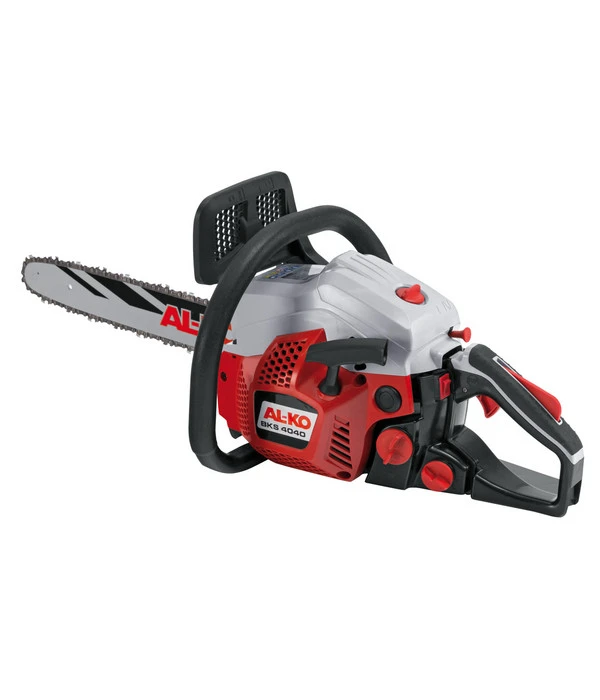 Leicht, handlich und trotzdem leistungsstark – das sind die wichtigsten Attribute der AL-KO Benzinkettensäge BKS 4040. Diese Kettensäge bringt nur 5,3 kg auf die Waage und zeigt mit einer Motorleistung von 1,5 kW eine starke Schnittleistung. Das hochwertige Original Oregon Schwert hat eine Länge von 40 cm, eine automatische Kettenschmierung und überzeugt mit einer enorm langen Lebensdauer. Für sicheren Halt bei allen Sägearbeiten sorgt die Baumanschlagkralle. Zum leichten Start ist die AL-KO Benzinkettensäge BKS 4040 mit einer Easy Start Funktion ausgestattet. Die effektive Kraftübertragung durch den leichtlaufenden Umlenkstern reduziert den Verschleiß an der Schwertspitze und verringert die Rückschlagneigung der AL-KO Benzinkettensäge BKS 4040. Für den Fall, dass die Säge bei einem Rückschlag zurückprallt, wird innerhalb von 0,12 Sekunden die automatische Kettenbremse ausgelöst.