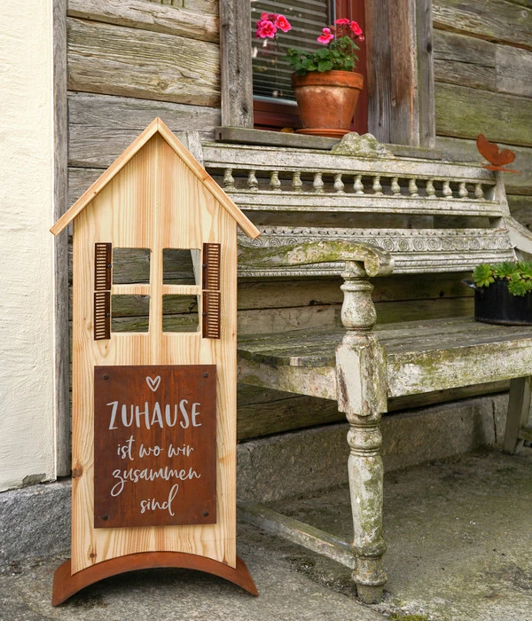 Wollen Sie Ihren Eingangsbereich mit einer einladenden Geste verzieren? Dann lassen Sie sich vom Holz-Ständer Zuhause der Firma Badeko begeistern. Der schöne Spruch ist für jeden Ihrer Gäste ein herzlicher Willkommensgruß mit der Botschaft, sich gleich bei Ihnen wohlzufühlen. Auch im Garten, Foyer oder Wintergarten punktet das kleine Deko-Häuschen mit seinem einzigartigen Charme. Zudem überzeugt seine Qualität, denn es wurde sorgsam aus bayerischem Lärchenholz hergestellt. Kontrastiert wird dieses Naturmaterial durch dekorative Details im angesagten Edelrost-Design. Hierzu gehören der Standfuß, das Schild mit dem Spruch sowie die kleinen Fensterläden, die dem Accessoire einen rustikalen Charme verleihen.