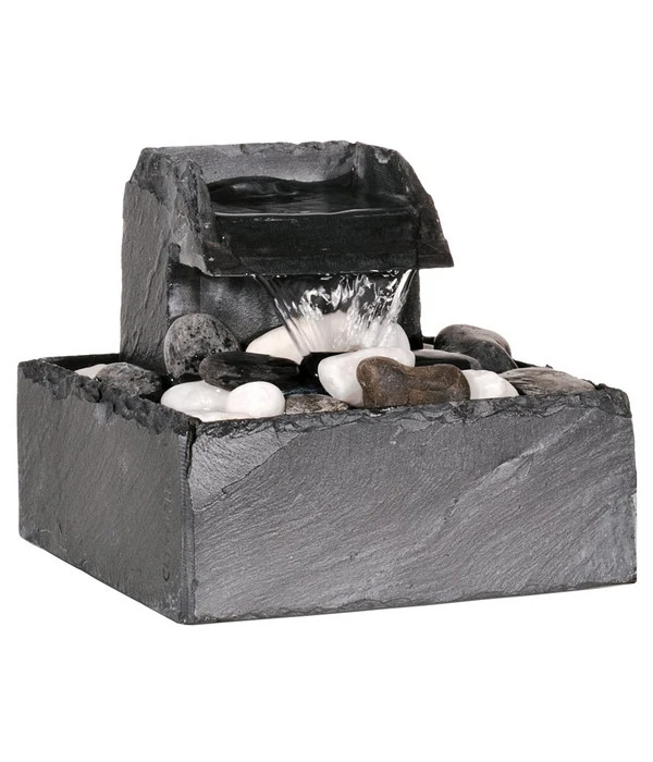 Sanft plätschert das Wasser über die runden Kiesel, während das Auge langsam Ruhe auf dem leicht schimmernden Schiefer findet. Immer mehr Frieden und Entspannung stellen sich in Körper und Gedanken ein – wenn Sie jetzt das Bedürfnis nach meditativer Erholung verspüren, ist der Climaqua Zimmerbrunnen Samui genau das Richtige für Sie. Mit ihm lässt sich jedes Zimmer in einen kleinen Rückzugsort vom Alltag verwandeln. Als Material wurde der traditionsreiche Schiefer verwendet, wodurch sich der geometrisch gehaltene Climaqua Zimmerbrunnen Samui in beinahe jede Umgebung einfügt.