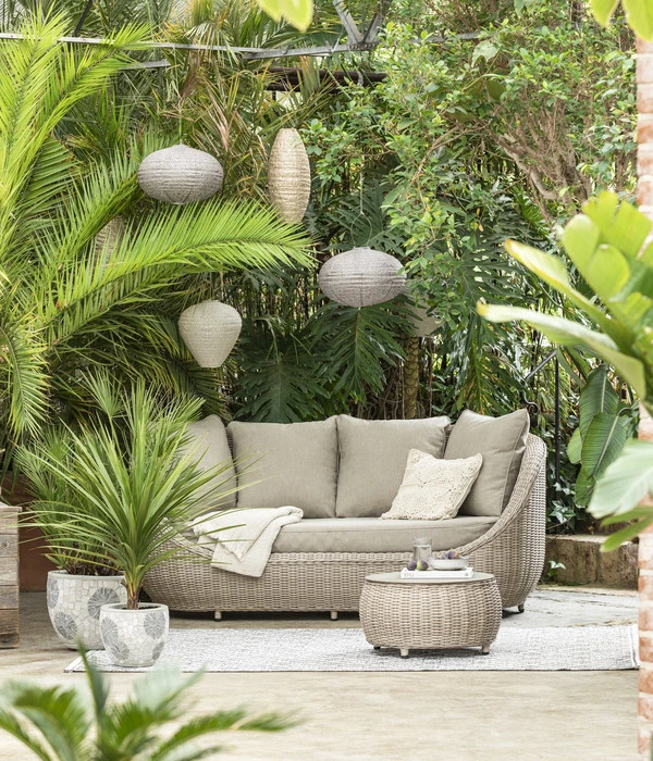Exotische Pflanzen wie Palmen, Bananen oder Bambus bilden einen perfekten Gegenpart zum Dehner Loungesofa Bari und dem praktischen Tisch, der das Set ergänzt. So kreieren Sie Asia-Feeling pur! Noch wohnlicher wird Ihr neuer Lieblingsplatz im Grünen mit einem schicken Outdoor-Teppich in Naturtönen, den Sie natürlich auch hier bei Dehner finden. Mit farblich abgestimmten Lampions oder Lichterketten schaffen Sie abends eine magische Atmosphäre. Wer will denn da noch schlafen gehen?