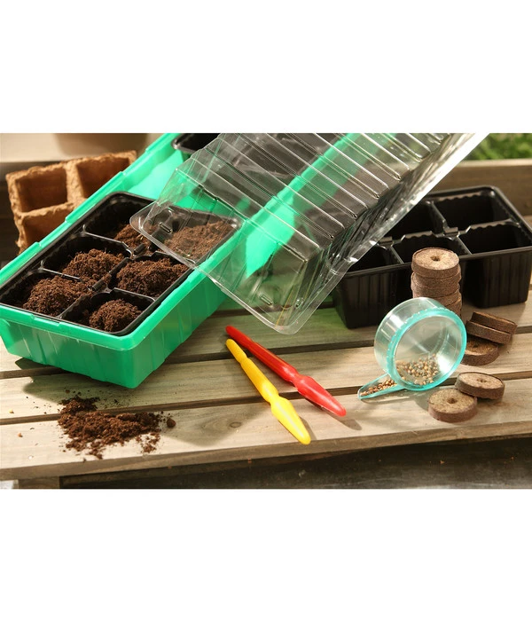 Mit dem Dehner Zimmergewächshaus Frans ist die eigene Anzucht in Wohnräumen ein Kinderspiel. Die Kunststoffbehälter werden einfach mit der passenden Erde befüllt. Ideal dafür eignet sich eine spezielle Erde zur Anzucht oder für Jungpflanzen, da Spezialerde optimal auf die Anforderungen von Stecklingen und jungen Pflanzen abgestimmt ist. Mit Hilfe eines Pikierstabes bringen Sie die Samen ganz einfach in die Erde. Haben Sie die Erde mit ausreichend Feuchtigkeit versorgt, können Sie den transparenten Deckel des Zimmergewächshäuschens schließen und das Kunststoff-Gewächshaus an den ausgewählten Platz stellen. Der durchsichtige Deckel bringt viel Licht ins Innere und sorgt so für optimale Bedingungen bei der Anzucht in Wohnräumen. Zudem haben Sie dadurch den vollen Durchblick und können Ihre kleinen Schützlinge beim Wachsen beobachten. Das Gewächshaus Frans der Markenqualität ist ausschließlich bei Dehner erhältlich.