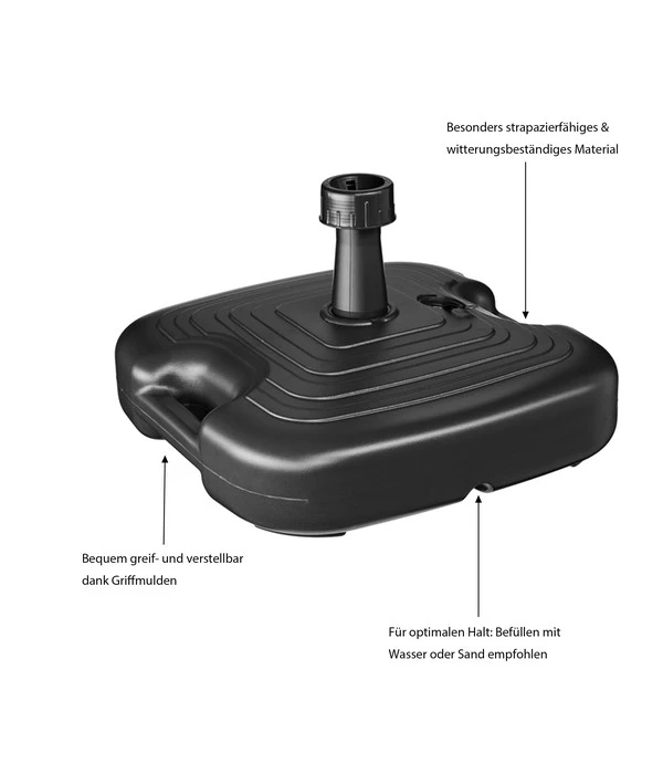 Ohne einen Sonnenschirm lässt es sich im Sommer im Freien oft kaum entspannen. Doch selbst der beste Sonnenschirm spendet Ihnen keinen Schatten, wenn er nicht optimal platziert wurde. Der Sonnenschirm-Ständer, Kunststoff, 45 x 45 cm, ist die ideale Lösung, wenn Sie auf der Suche nach einem standhaften Schirmständer sind. Der Ständer weist ein Volumen von 20 Liter auf und kann mühelos mit Sand oder Wasser befüllt werden. Gefüllt erreicht der Sonnenschirmhalter ein Gewicht von circa 20 kg. Auch bei Wind wird Ihr Sonnenschirm daher fest an seinem Platz stehen. Der Sonnenschirm-Ständer, Kunststoff, 45 x45 cm, ist für Stöcke bis zu 25 mm Durchmesser geeignet. Mit einem Eigengewicht von nur 0,88 kg lässt sich der quadratische Ständer ideal mitnehmen. Stecken Sie Ihren Schirm im Schwimmbad nicht mehr mühevoll in die Erde, sondern befüllen Sie einfach den anthrazitfarbenen Schirmständer mit Wasser oder Sand und genießen Sie die kühle Brise.