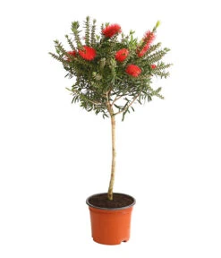 Am liebsten steht der Callistemon an einen warmen, vollsonnigen Standort auf der Terrasse oder auf dem Balkon. Die Erde sollte stets leicht feucht gehalten werden, denn bei Trockenzeiten verliert der Zylinderputzer seine hübschen Blätter. Während er kurze Durststrecken nach einiger Zeit wieder vergisst und neu austreibt, ist er Ihnen bei Staunässe tödlich beleidigt. Von April bis August können Sie alle zwei Wochen etwas Flüssigdünger zum Gießwasser hinzugeben. Das Myrtengewächs bevorzugt saures Substrat, deswegen eignet sich zum Umpflanzen im Frühjahr Dehner Rhododendronerde, da diese für einen niedrigen PH-Wert sorgt. Die Kübelpflanze ist gut schnittverträglich, weshalb Sie auch die verwelkten Blütenstände bedenkenlos zurückschneiden können, dies fördert zudem einen kompakten Wuchs und eine reiche Verzweigung der Triebe. Damit der Zylinderputzer die kühle Jahreszeit übersteht, geben Sie ihm am besten einen hellen aber kühlen Platz. Bei Temperaturen bis zu 10°C können Sie die Wasser- und Düngergabe auch deutlich reduzieren